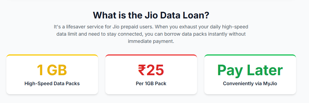 - Eligibility: The service is available exclusively to Jio prepaid users. To be eligible, a user must have an active base plan with remaining validity and no outstanding data loans from previous uses.